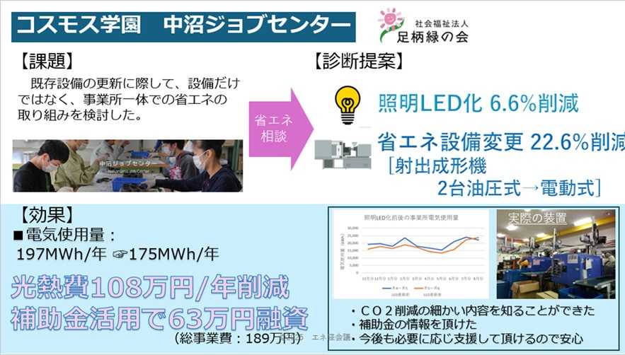 照明を順次LED化する、射出成型機を油圧式から電動式に計画的に変更しながらエネルギー削減に向けて地道な努力がなされている。これら含めて省エネ診断を行った。