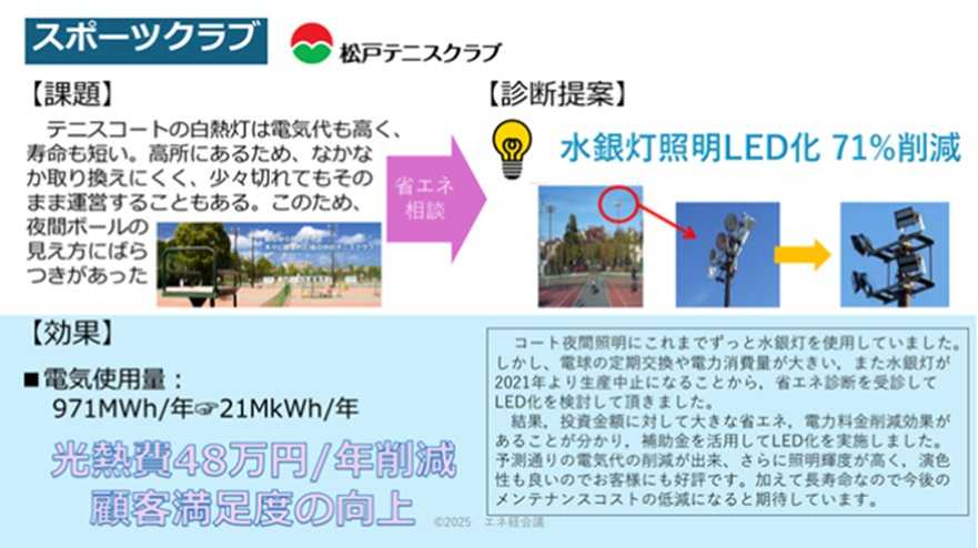 以上の診断結果により、夜間使用するコートのみ高効率照明に補助金使用して置き換えることにより、設備費用を抑え、維持費も安くなると同時にコート使用者からは照明が明るくなり、ボールが見えやすいと好評です、とオーナーからも喜ばれました。