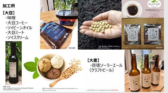 収穫された有機大豆・大麦は、味噌、大豆コーヒー、大豆オイル、大豆ミート、ソイスクリーム(アイスクリーム用)、地ビール(ソーラーエール)などに6次産業化され、付加価値をつけて販売されている。